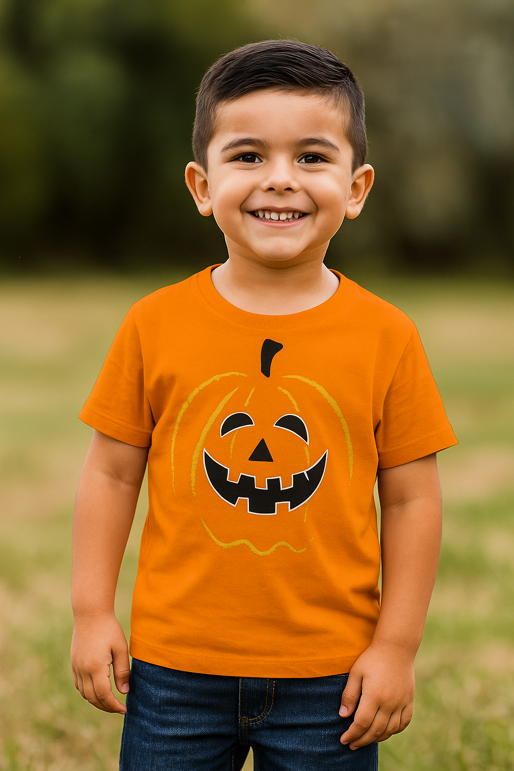 Blusa Estampa abóbora, Gola redonda, manga curta, com estampa muito Divertida que Brilha no escuro
