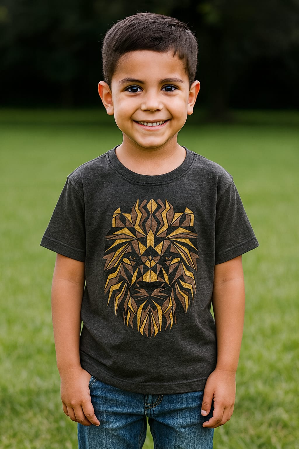 Estilo e atitude em uma só peça! Esta camiseta infantil na cor chumbo traz uma estampa exclusiva de leão em design geométrico, que transmite força e personalidade.