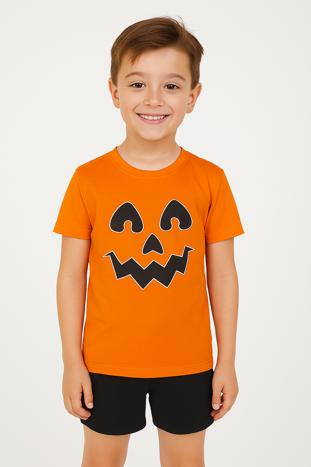 A camiseta laranja traz uma estampa de carinha de abóbora que brilha no escuro, deixando o look ainda mais especial quando as luzes se apagam!