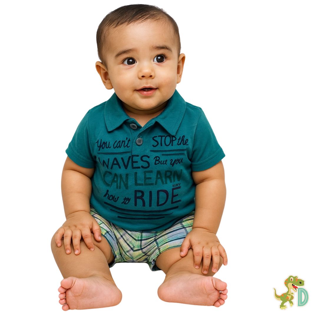 O shorts xadrez em tons suaves completa o visual com um toque moderno e fresquinho, ideal para dias de passeio ou momentos especiais.
