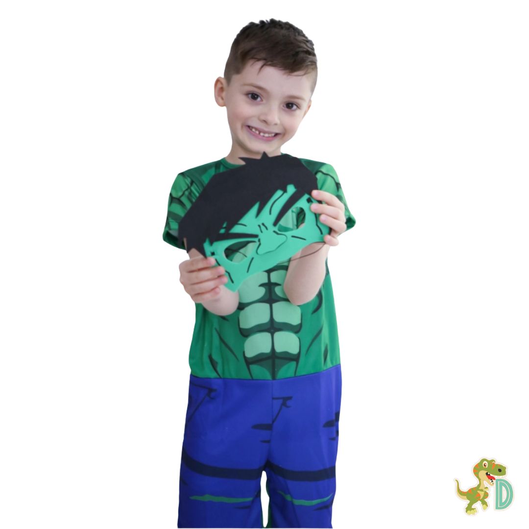 Feito para os mini-heróis que amam brincar e soltar a imaginação, o look vem completo com camiseta estampada do corpo do Hulk e shorts temático, além da máscara divertida que deixa tudo ainda mais realista.