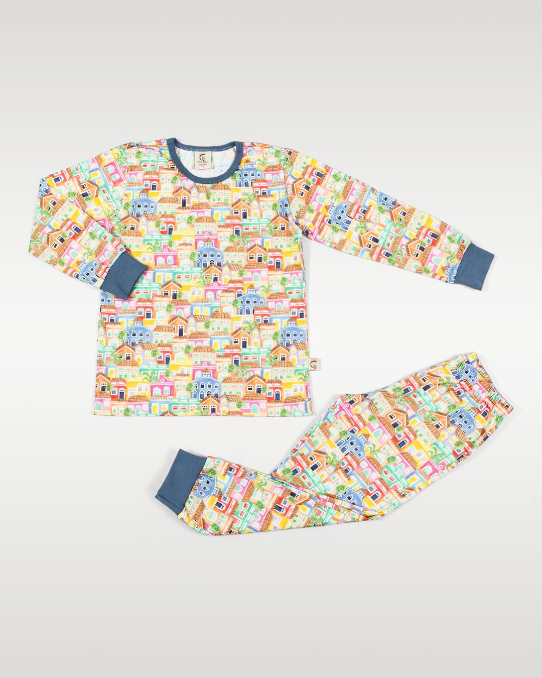 Pijama infantil longo em meia malha premium estampada e ribana nos punhos e na gola, para facilitar a passagem da cabeça da criança.